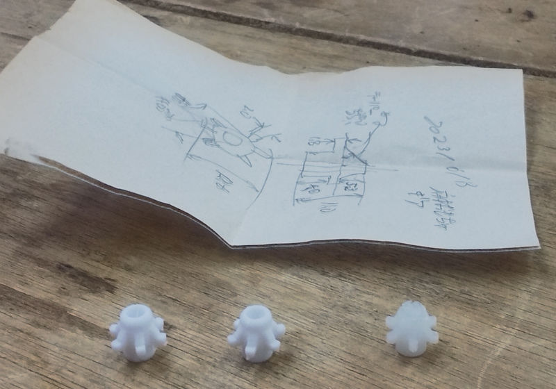2023-07-09 / 最終更新日時 : 2023-07-09 inoie 開院結果 R5年7/8開院結果 受付数は何故か減少傾向ですが、今回はやや上昇の23件でした。コロナ禍緩和と共に通常の30~40件位に回復することが期待されます。今回は高橋ドクターの3Dプリンター制作部品利用第一号が出たことが大きなニュースでした。 ドクター 10横澤、平野、佐藤、山口、酒井、松原、天野、高橋、積田、(敬称略)、井家(記録)受付数23修理完了数18入院 3修理不能数(他) 2 ◎3Dプリンター応用制作部品第一号機 (骨董品的サッカーゲーム) 歯車が欠落・紛失部分の状態 3DPで制作した歯車部品を装着し治療完了 3Dデータ作成のための図面