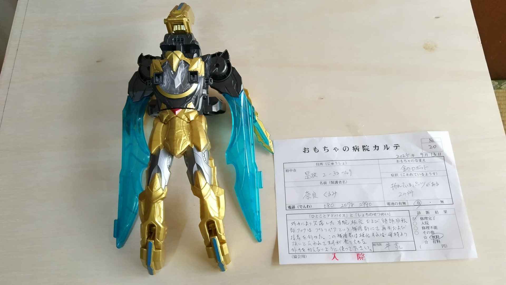 | 治療内容 | 上部断線は支柱分解し電源線1本を補助線を使いハンダ付け。支柱・合わせ溝部の接合にはプラリペアを使用。 |