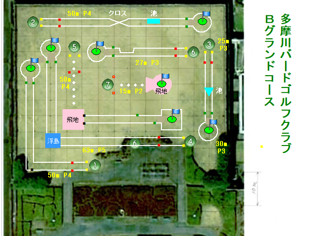 グランドAに設営する広々としたコース。1ホールは林越えショートカットのリスキーコース、3ホールと7ホールはダブルかご。5、7ホールは飛地コースです。年数回のコンペはこのコースを使います。